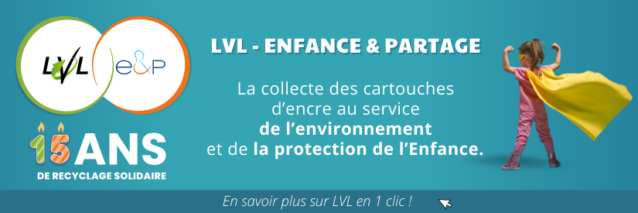En effet, depuis 2009, LVL s’engage à faire un don à Enfance & Partage pour chaque cartouche – jet d’encre ou laser vide réutilisable – collectée auprès des établissements scolaires par le biais du programme « Opération Cartouches » et également auprès de centres commerciaux, entreprises privées, administrations, associations, qui ont choisi LVL pour les accompagner dans leur démarche éco-solidaire en collectant pour Enfance & Partage.
